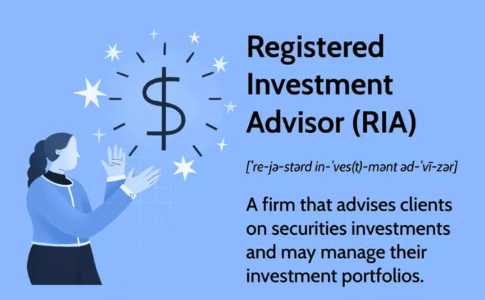 RIA -एक व्यक्ति या संगठन हो सकता है और व्यक्तियों को निवेश सलाह दे सकता है। आरआईए सेबी के साथ पंजीकृत हैं और म्यूचुअल फंड वितरकों की तुलना में उनके ग्राहकों के प्रति अधिक दायित्व हैं। अपने ग्राहकों के सर्वोत्तम हित में वित्तीय सलाह देना उनका अपने ग्राहकों के प्रति प्रत्ययी कर्तव्य है। आरआईए की भूमिका में अपने ग्राहकों के लिए वर्तमान और भविष्य की वित्तीय स्थिति के अलावा उनके वित्तीय लक्ष्यों को ध्यान में रखते हुए एक वित्तीय योजना तैयार करना शामिल है। वे अपनी सेवाओं के लिए एक शुल्क भी लेते हैं जो एक निश्चित शुल्क या उन संपत्तियों के प्रतिशत के रूप में हो सकता है जिन पर वे सलाह देते हैं।